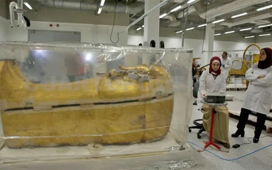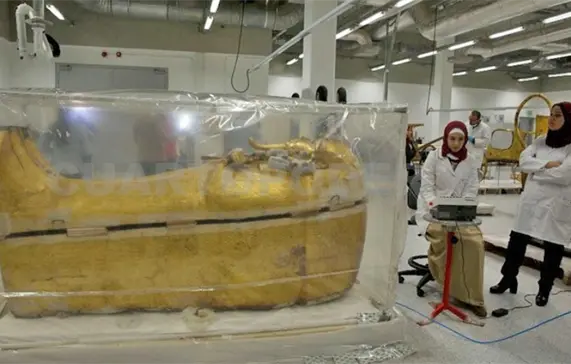 Las labores de restauración empezaron a mediados de julio, después de que el sarcófago, de tres niveles, fuera trasladado al nuevo Gran Museo Egipcio de El Cairo desde el Valle de los Reyes, en Luxor, en el sur de Egipto.