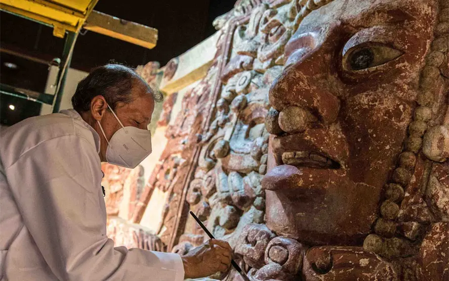 Un joven gobernante flanqueado por dos ancianos con ofrendas de agua y fertilidad es parte de la poca información que se ha podido deducir sobre el friso maya Relieve de Placeres, que actualmente se restaura en vivo frente a los visitantes del Museo Nacional de Antropología (MNA).