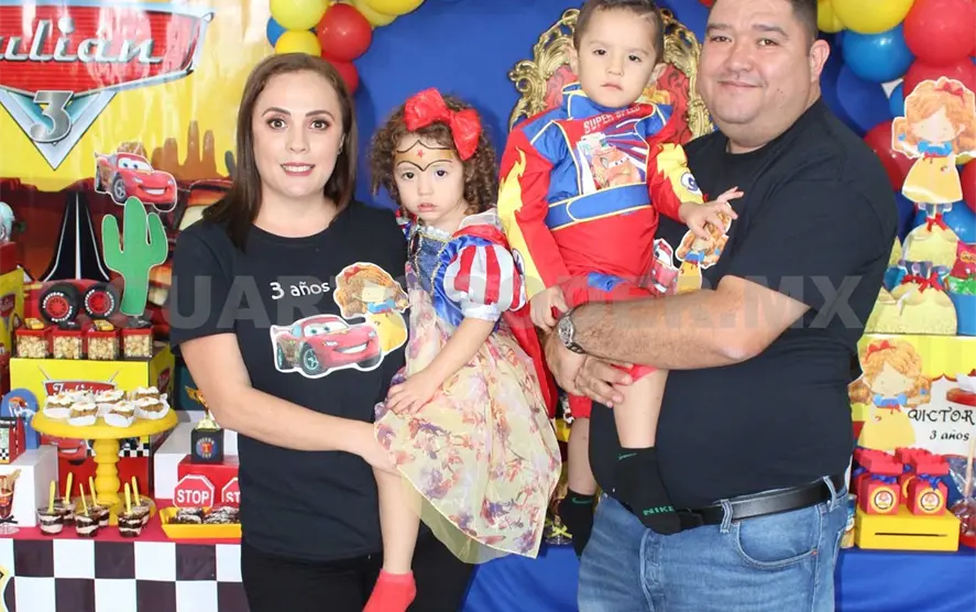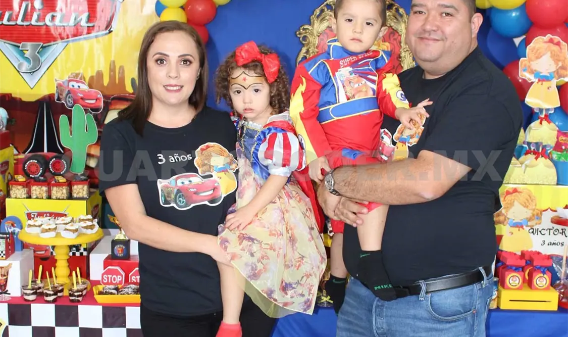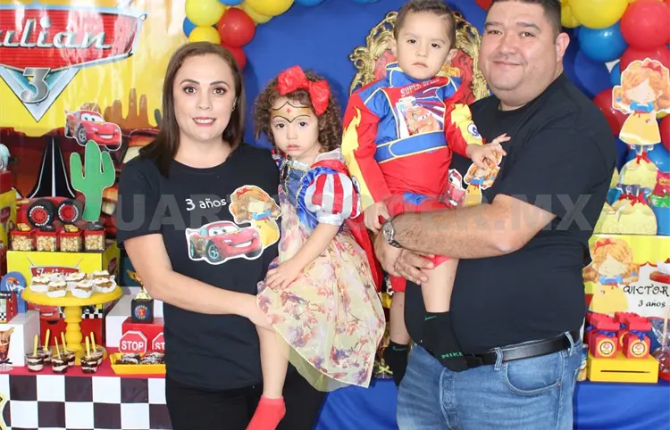Con temática de sus películas animadas favoritas, Cars y Blanca Nieves, los hermanitos Victoria y Julián fueron festejados por sus 3 años de vida. Los papás de los cumpleañeros recibieron con gran emoción a cada uno de sus invitados, quienes llevaron lindos regalos para los pequeños. ¡Felicidades!