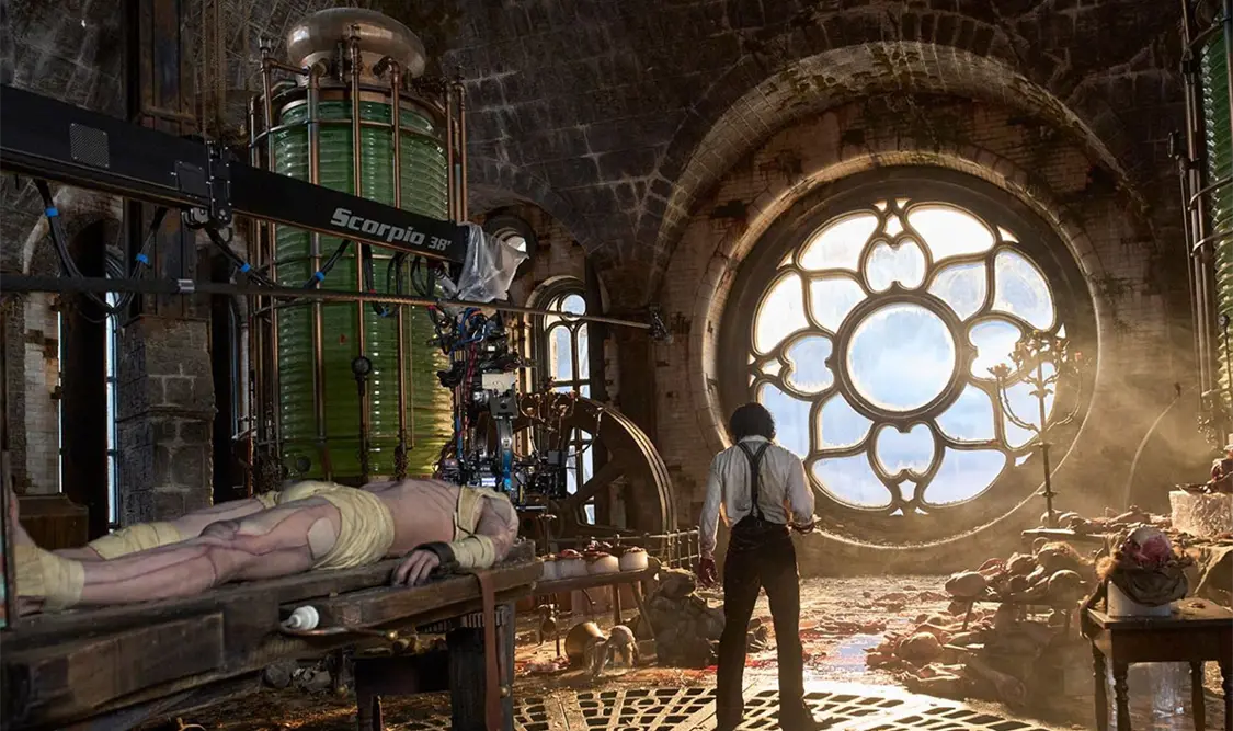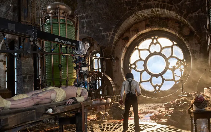 El “armado” de la Criatura sobre el cuerpo de Elordi requirió de 42 aparatos protésicos independientes (únicamente la cabeza y hombros contabilizaban 12). Cuando lo vea en grande, note que el rostro tiene muchos colores y eso es porque al ser hecho con restos de varias personas, la piel no “envejece” al mismo tiempo, por ello tiene partes azules.