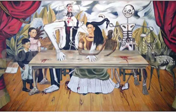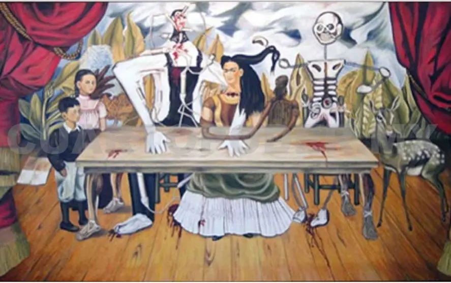 La mesa herida es una de las pinturas más importantes de la artista; mide 1.2 metros de alto por 2.4 metros de largo, y la última vez que se supo de ella fue en 1955, después de que Diego Rivera la solicitó para una exhibición en Polonia.