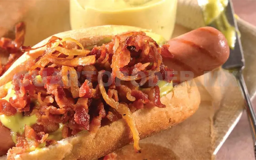4. Asa las salchichas. Coloca una en cada pan, unta un poco de la mayonesa de aguacate y finaliza con un poco de las cebollas con tocino encima de todo.