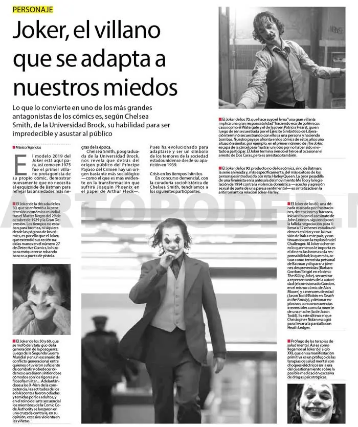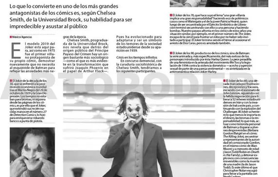 Chelsea Smith, posgraduada de la Universidad Brock, nos revela que detrás del origen público del Príncipe Payaso del Crimen hay un origen bastante más sociológico —como el que es más evidente en la transformación que sufrirá Joaquin Phoenix en el papel de Arthur Fleck—. Pues ha evolucionado para adaptarse y ser un símbolo de los temores de la sociedad estadounidense desde su aparición en 1939.