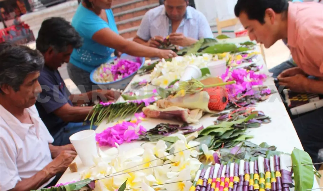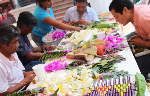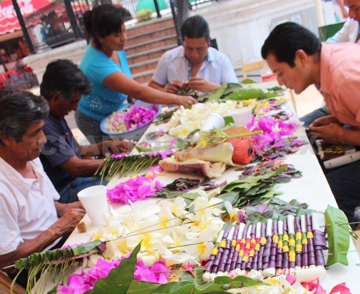 Con el uso de tijeras escolares y flores, mujeres y hombres elaboraban los joyanaqués bajo intenso calor que hace en abril en esta ciudad capital, mismo que fue combatido con un pozol de cacao bien frío.