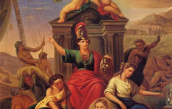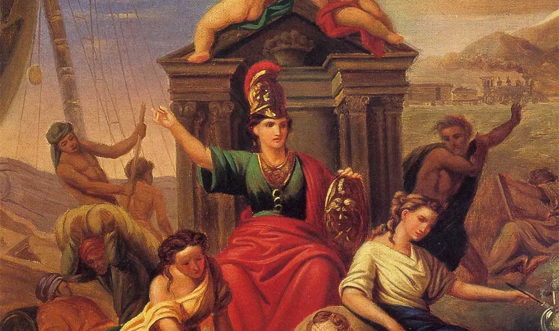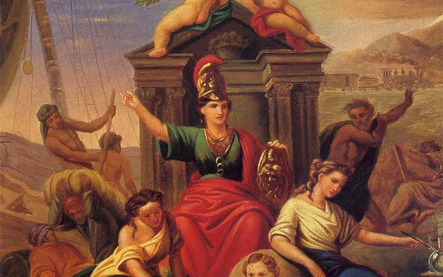 “A los pies de Minerva se hallaban sentadas dos figuras alegóricas, cada una de las cuales se identificaba con su nombre pintado en falso relieve: a la izquierda, la Ciencia, personificada por una mujer de cabello castaño que operaba una brújula de tangentes, un dispositivo que había sido inventado en 1825 por el francés Claude Pouillet para medir la intensidad de la corriente eléctrica y que también se asociaba a la medición del magnetismo, ambos fenómenos físicos muy presentes en el siglo XIX en varias disciplinas científicas y en la idea de progreso y tecnificación de las sociedades; y a la derecha, la Industria, personificada por una mujer rubia que con su mano izquierda introducía una varilla en un matraz del cual emanaba vapor y que descansaba el brazo derecho en una esfera ubicada detrás de un tercer geniecillo que pedía silencio con un ademán. En los flancos había dos escenas: a la izquierda, un navío que tocaba puerto y hombres que descargaban sus mercancías como clara referencia al comercio ultramarino; y a la derecha, un ferrocarril que corría entre planicies y montañas, y, abajo de él, una figura alegórica de la ignorancia que huía despavorida y, junto a ella, Clío, la musa de la Historia, de espalda a la escena, escribiendo en una tableta”, explica.