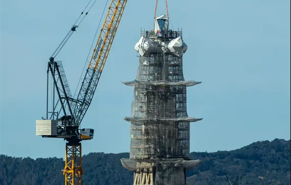 Desde las nueve de la mañana, la gran grúa de las obras ha trabajado para depositar el brazo superior de la cruz: la pieza ha sido enganchada por cuatro cables rojos, ha aguardado suspendida en una cubierta del templo, y a las 10.38 horas ha comenzado a levantarse. Antes de las 11 ya estaba en lo alto de la torre, donde los operarios han trabajado para fijarla con 40 tuercas que se aprietan con gatos hidráulicos, ha detallado el arquitecto responsable de los terminales, Mauricio Cortés.