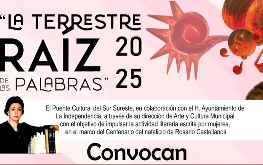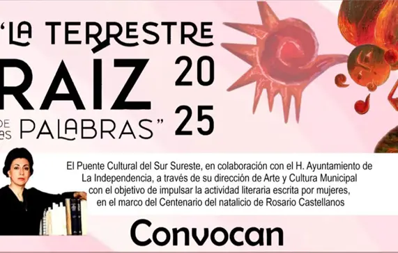 La Terrestre Raíz de las Palabras lanzó su convocatoria 2025, dirigida a escritoras mayores de 18 años, nacidas y radicadas en el estado de Chiapas. El certamen es impulsado por iniciativa de El Puente Cultural del Sur-Sureste, en colaboración con el Ayuntamiento de La Independencia, a través de su dirección de Arte y Cultura.