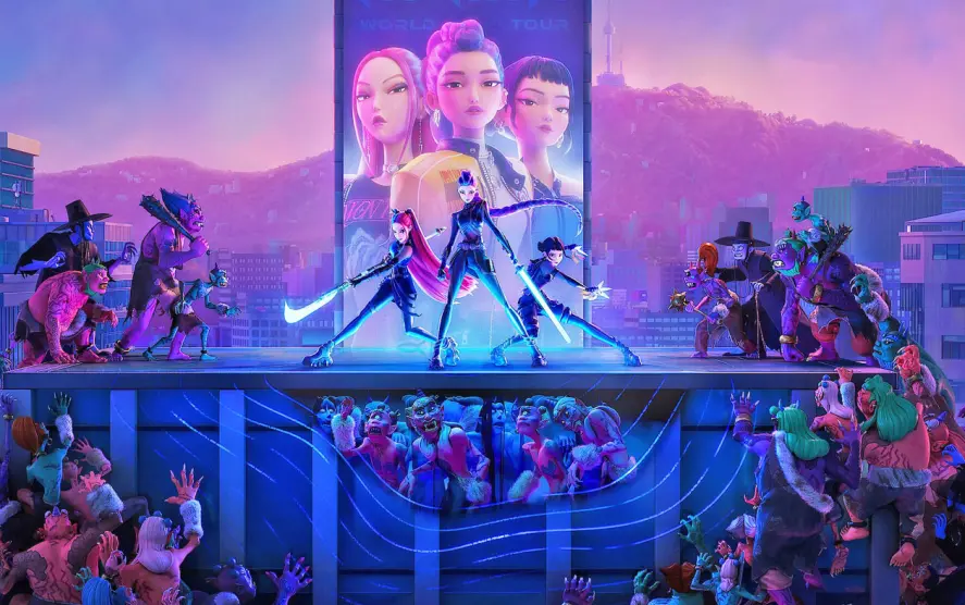 Kang y Appelhans usan el contexto del k-pop para traer a la pantalla secuencias de batalla mezcladas con números musicales que dan como resultado una alocada y entretenida aventura de autodescubrimiento. En lugar de buscar el realismo, los directores usan el elemento del espectáculo y el arte de la animación con mucho ingenio; la escena del inicio, por ejemplo, nos presenta al trío de heroínas peleando con un grupo de demonios mientras se lanzan de un avión que se destruye a pedazos y concluye con ellas cayendo en medio de un estadio lleno de fans eufóricos por la extravagante entrada, todo esto mientras rapean en el aire o dan espadazos al ritmo de la música.