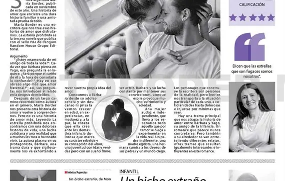 Después de un largo camino recorrido como autora en el género, María Border nos presenta otra historia de amor y vuelve a sorprendernos. Pero no es una historia de amor más. Leyendo La estrella prohibida nos encontramos con una dolorosa historia de vida, una lucha cotidiana y una realidad que a muchos les toca o ha tocado vivir. La autora plasma en su protagonista, Bárbara, una trama dura y que sigilosamente nos va exhortando a rever nuestra propia idea del amor.