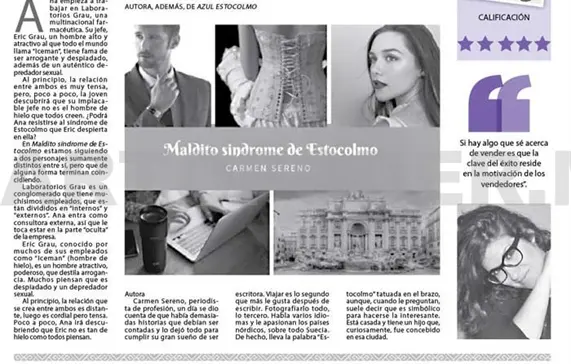 Carmen Sereno, periodista de profesión, un día se dio cuenta de que había demasiadas historias que debían ser contadas y lo dejó todo para cumplir su gran sueño de ser escritora. Viajar es lo segundo que más le gusta después de escribir. Fotografiarlo todo, lo tercero. Habla varios idiomas y le apasionan los países nórdicos, sobre todo Suecia. De hecho, lleva la palabra “Estocolmo” tatuada en el brazo, aunque, cuando le preguntan, suele decir que es simbólico para hacerse la interesante. Está casada y tiene un hijo que, curiosamente, fue concebido en esa ciudad.