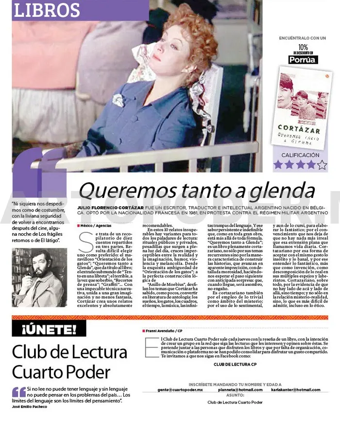 Se trata de un recopilatorio de diez cuentos repartidos en tres partes. Resulta difícil elegir uno como preferido: el maravilloso “Orientación de los gatos”; “Queremos tanto a Glenda”, que da título al libro; el extraño submundo de “Texto en una libreta”; el terrible, a la vez que soberbio, “Recortes de prensa”; “Graffiti”… Con una impecable técnica narrativa, unida a una gran imaginación y no menos fantasía, Cortázar crea unos relatos excelentes y absolutamente recomendables.