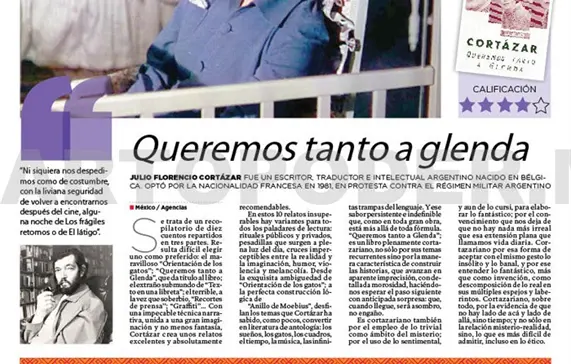 “Anillo de Moebius”, desfilan los temas que Cortázar ha sabido, como pocos, convertir en literatura de antología: los sueños, los gatos, los cuadros, el tiempo, la música, las infinitas trampas del lenguaje. Y ese sabor persistente e indefinible que, como en toda gran obra, está más allá de toda fórmula. “Queremos tanto a Glenda”; es un libro plenamente cortazariano, no sólo por sus temas recurrentes sino por la manera característica de construir las historias, que avanzan en aparente imprecisión, con detallada morosidad, haciéndonos esperar el paso siguiente con anticipada sorpresa: que, cuando llegue, será asombro, no engaño.