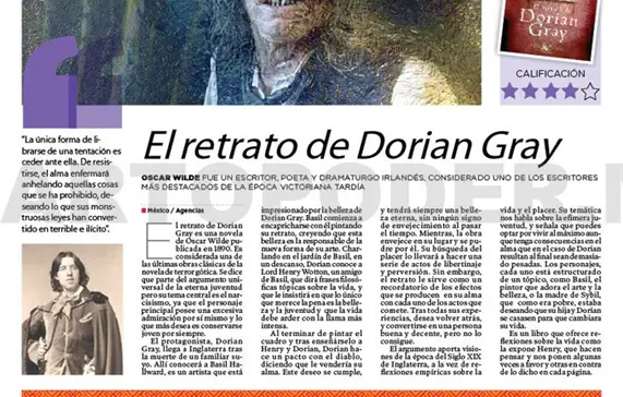 El retrato de Dorian Gray es una novela de Oscar Wilde publicada en 1890. Es considerada una de las últimas obras clásicas de la novela de terror gótica. Se dice que parte del argumento universal de la eterna juventud pero su tema central es el narcisismo, ya que el personaje principal posee una excesiva admiración por sí mismo y lo que más desea es conservarse joven por siempre.
