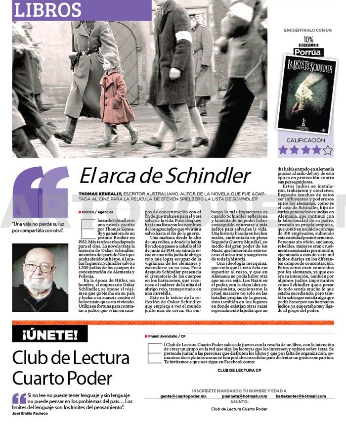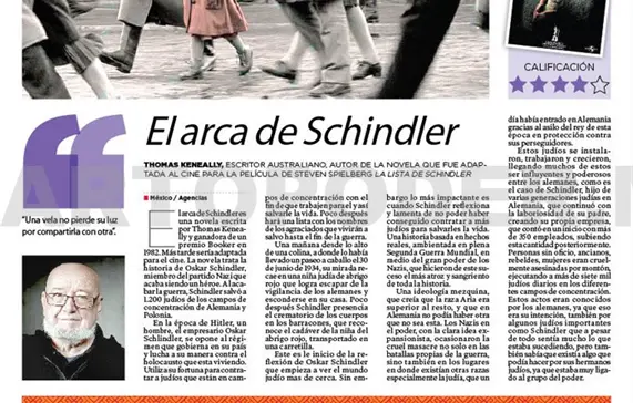 El arca de Schindler es una novela escrita por Thomas Keneally y ganadora de un premio Booker en 1982. Más tarde sería adaptada para el cine. La novela trata la historia de Oskar Schindler, miembro del partido Nazi que acaba siendo un héroe. Al acabar la guerra, Schindler salvó a 1.200 judíos de los campos de concentración de Alemania y Polonia.