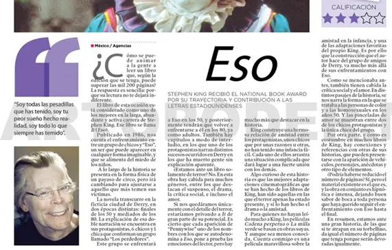 El libro de esta ocasión está considerado como uno de los mejores en la larga, abundante y activa carrera de Stephen King. Ese libro se llama It (Eso).