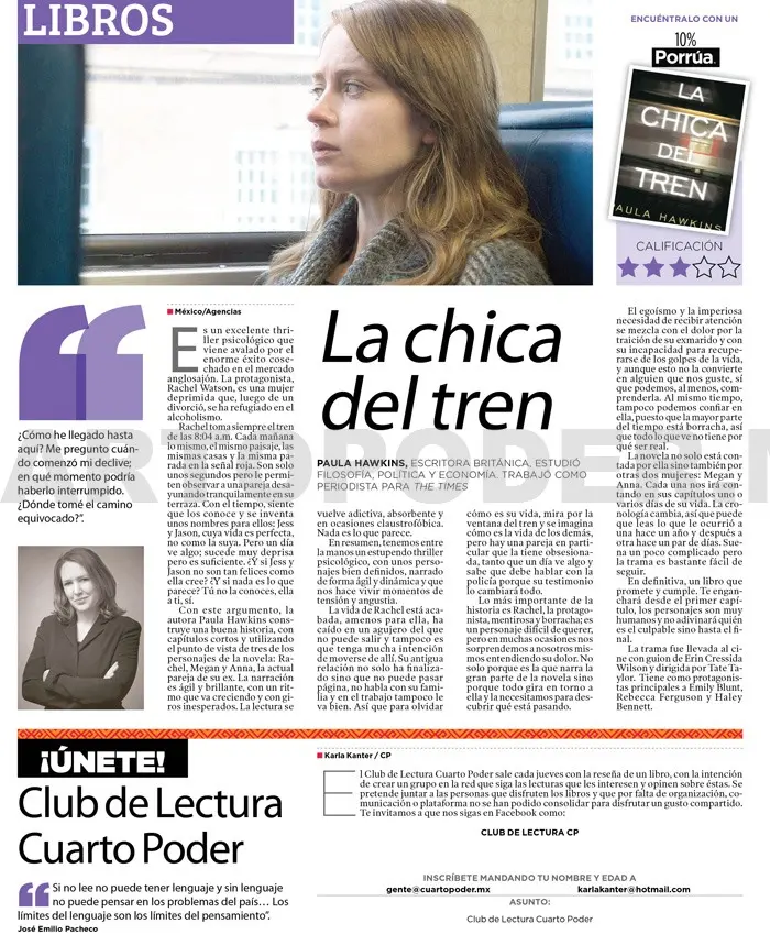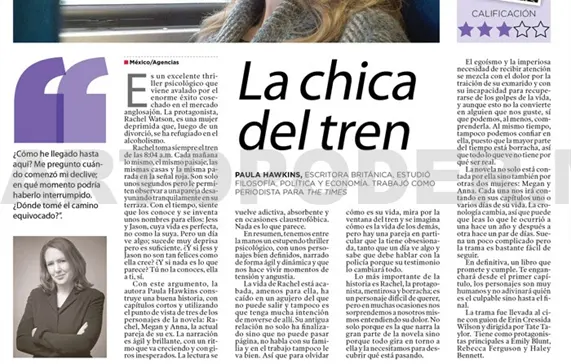 Es un excelente thriller psicológico que viene avalado por el enorme éxito cosechado en el mercado anglosajón. La protagonista, Rachel Watson, es una mujer deprimida que, luego de un divorció, se ha refugiado en el alcoholismo.