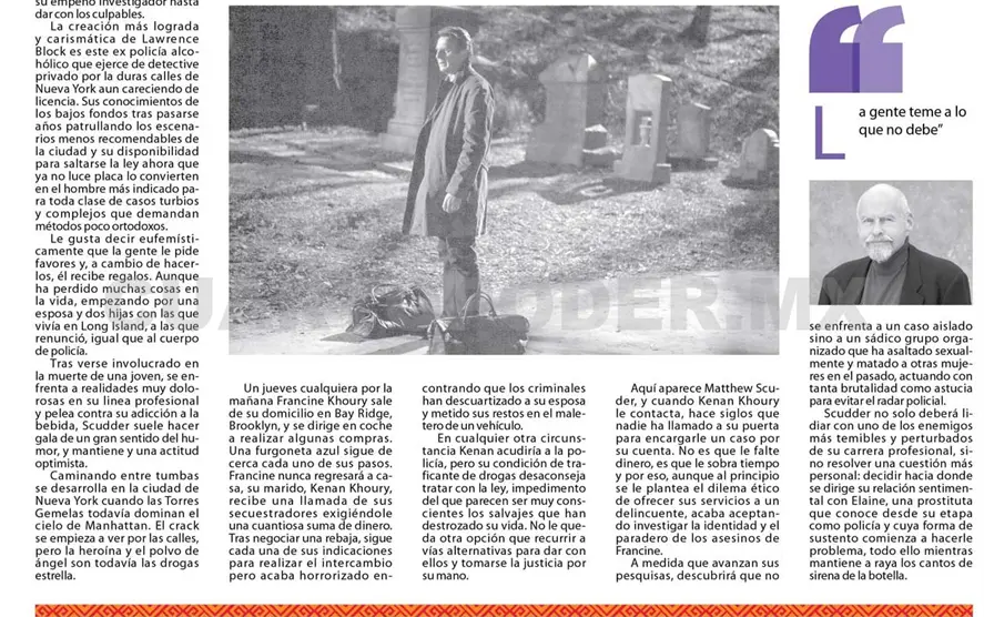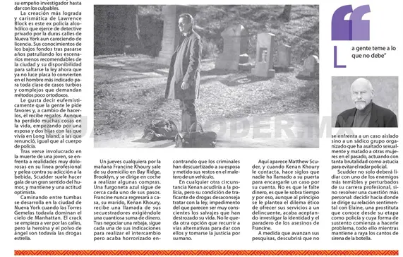 Aquí aparece Matthew Scuder, y cuando Kenan Khoury le contacta, hace siglos que nadie ha llamado a su puerta para encargarle un caso por su cuenta. No es que le falte dinero, es que le sobra tiempo y por eso, aunque al principio se le plantea el dilema ético de ofrecer sus servicios a un delincuente, acaba aceptando investigar la identidad y el paradero de los asesinos de Francine.