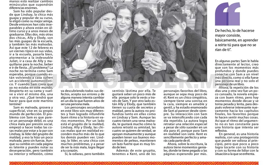 Sí, la odiaras, pero también sentirás lástima por ella. Te gustará saber un poco más de ella porque solo la verás a través de Sam. Y por otro lado están Ally y Elody, que también tienen su cuota de secretos y maldad, pero la autora no profundiza tanto en ellas como en Lindsay y Sam. Aunque las cuatro tienen una vena malvada, te gustará mucho cómo la autora retrató su amistad, las cuatro se quieren de verdad, se apoyan mutuamente y aunque pueden tener sus buenos momentos de peleas, mantienen un lazo fuerte que es muy lindo de leer.