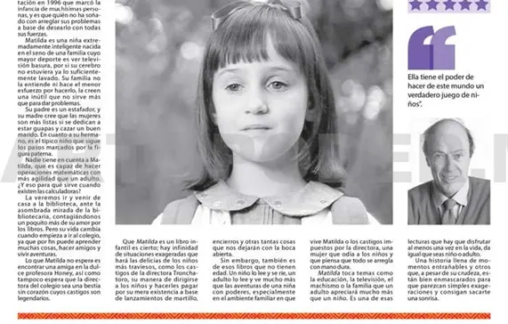 Sin embargo, también es de esos libros que no tienen edad. Un niño lo lee y se ríe, un adulto lo lee y ve mucho más que las aventuras de una niña con poderes, especialmente en el ambiente familiar en que vive Matilda o los castigos impuestos por la directora, una mujer que odia a los niños y que piensa que todo se arregla con mano dura.