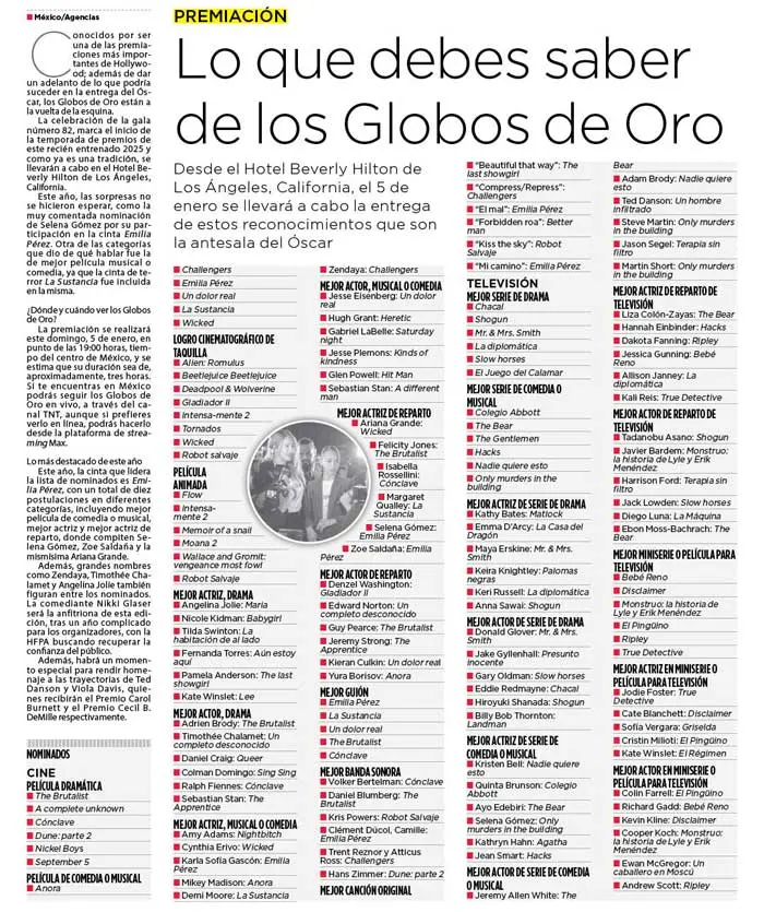 Este año, la cinta que lidera la lista de nominados es Emilia Pérez, con un total de diez postulaciones en diferentes categorías, incluyendo mejor película de comedia o musical, mejor actriz y mejor actriz de reparto, donde compiten Selena Gómez, Zoe Saldaña y la mismísima Ariana Grande.