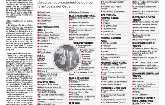 Este año, las sorpresas no se hicieron esperar, como la muy comentada nominación de Selena Gómez por su participación en la cinta Emilia Pérez. Otra de las categorías que dio de qué hablar fue la de mejor película musical o comedia, ya que la cinta de terror La Sustancia fue incluida en la misma.