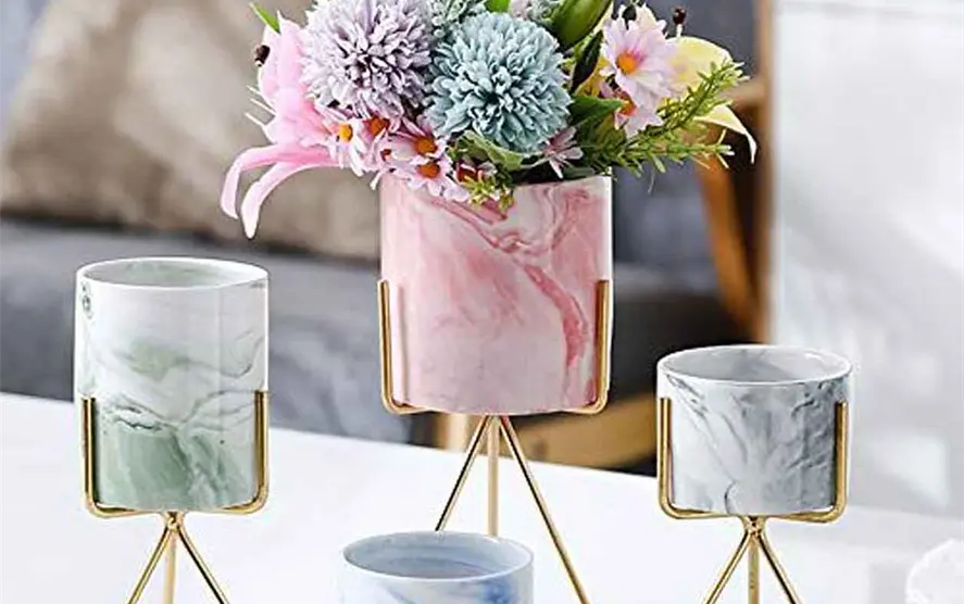 Si se pretende transmitir mayor elegancia y sofisticación, estos maceteros de cerámica con soporte de metal son apropiados para decorar estanterías y mesas. Permiten ahorrar agua y ofrecen mayor vistosidad allá donde se sitúen. Se pueden adquirir con un total de dos maceteros.
