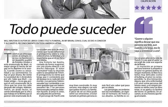 Una historia tan bonita, contada de forma magistral, con una pluma directa y sin mucho rebusque. El autor “normalizó” toda la situación sobre la sexualidad de Tretch. El protagonista no siente que tenga que ir contándolo por ahí porque no es nada del otro mundo. ¿Las personas heterosexuales van contándole a sus seres queridos que son heterosexuales? No. Y las personas homosexuales tampoco deberían hacerlo. El amor es amor, en cualquiera de sus formas.