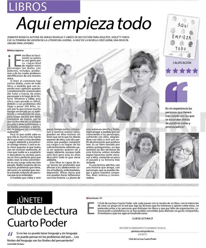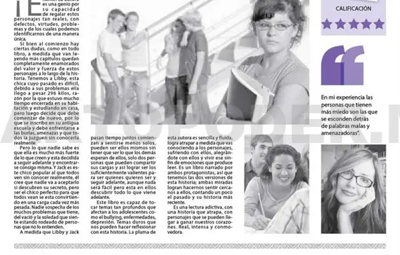 Este libro es capaz de tocar temas tan profundos que afectan a los adolescentes como el bullying, enfermedades, depresión. Temas duros que nos pueden hacer reflexionar con esta historia. La pluma de esta autora es sencilla y fluida, logra atrapar a medida que vas conociendo a los personajes, sufriendo con ellos, alegrándote con ellos y vivir ese sinfín de emociones que produce leer. Es un libro narrado por ambos protagonistas, así que tenemos las dos versiones de esta historia; ambas miradas logran hacernos sentir cercanos a ellos, contando un poco el pasado y su historia más reciente.