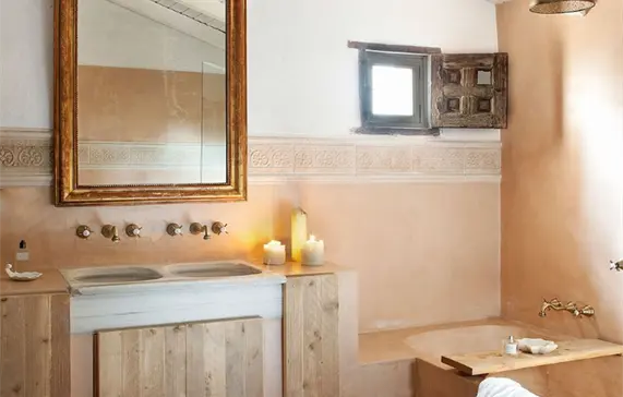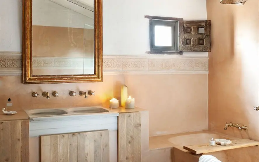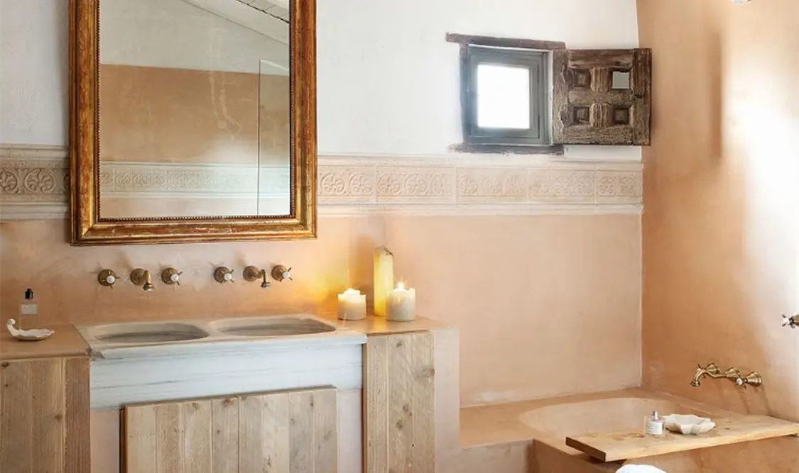 Los tonos tierra se extienden también a materiales como la madera, que se tiñe en tonos relajados y sencillos. Lo puedes ver en baños como el de esta masía en Mallorca.