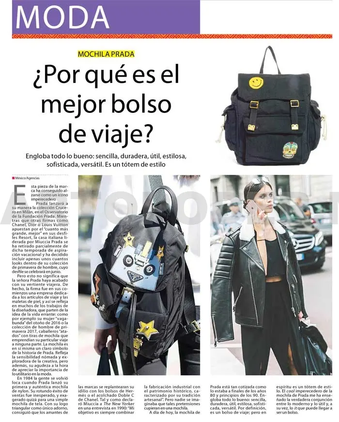 Pero esto no significa que la señora Prada haya acabado con su vertiente viajera. De hecho, la firma fue en sus comienzos una empresa dedicada a los artículos de viaje y las maletas de piel, y así se refleja en muchos de los trabajos de la diseñadora, que parten de la idea de la vida errante: como por ejemplo su mujer “vagabunda” del otoño de 2016 o la colección de hombre de primavera 2017, caballeros “atados” con tiras de mochila que emprendían su particular viaje a ninguna parte. La mochila es en sí misma un claro símbolo de la historia de Prada. Refleja la sensibilidad nómada y exploradora de la creativa, pero además, su agudeza a la hora de apreciar la importancia de lo utilitario en la moda.