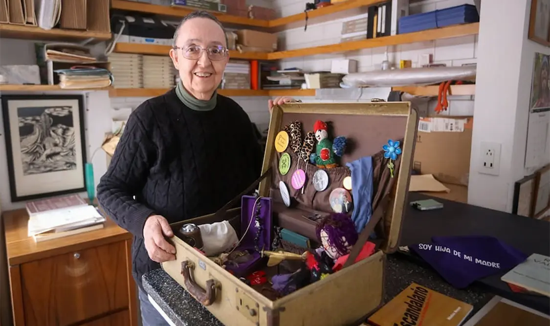 Mayer, icónica artista feminista, llevará una maleta, que a primera vista podría parecer está llena de tiliches aleatorios. Sin embargo, cada pieza tiene una historia detrás de sí. Por ejemplo, hay una botella de Shalimar, de Guerlain, el perfume que usaba su madre, quien falleció en 1980. También hay un temporizador de gallina negra, que hace referencia al grupo artístico que conformó con Maris Bustamante, Polvo de Gallina Negra, así como fotografías personales, un collar con las cenizas de su hermano, un collar de huesos que le hizo su novio de la preparatoria y más.