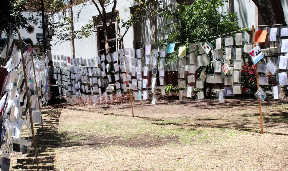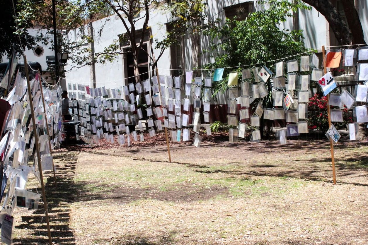 La muestra abrió el 25 de marzo, en los jardines del recinto. La exhibición incluye 885 postales elaboradas con técnicas como pintura, ilustración, collage y mixta. Cada pieza presenta una interpretación de la paz desde la mirada de niñas, niños y jóvenes participantes.