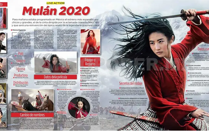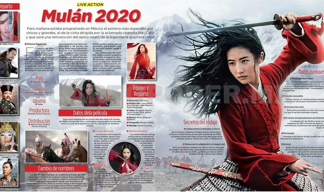 Así, disfrazada de hombre, logra ocupar su puesto y marchar a la guerra, donde luchara valientemente junto al ejército imperial. La joven demostrará entonces su valor, pero ¿tendrán compasión cuando descubran quién es?Para mañana estaba programado en México el estreno más esperado por chicos y grandes, el de la cinta dirigida por la aclamada cineasta Niki Caro y que será una reinvención del épico relato de la legendaria guerrera china
