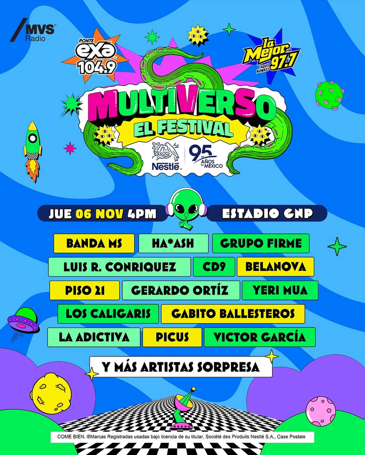 EXA FM 104.9 y La Mejor FM 97.7, las dos estaciones de radio más influyentes en México se fusionan para dar lugar al evento más espectacular de la música, Festival Multiverso Nestlé 95 Años, un evento que reúne a los representantes más importantes de cada género para impacto de su audiencia.