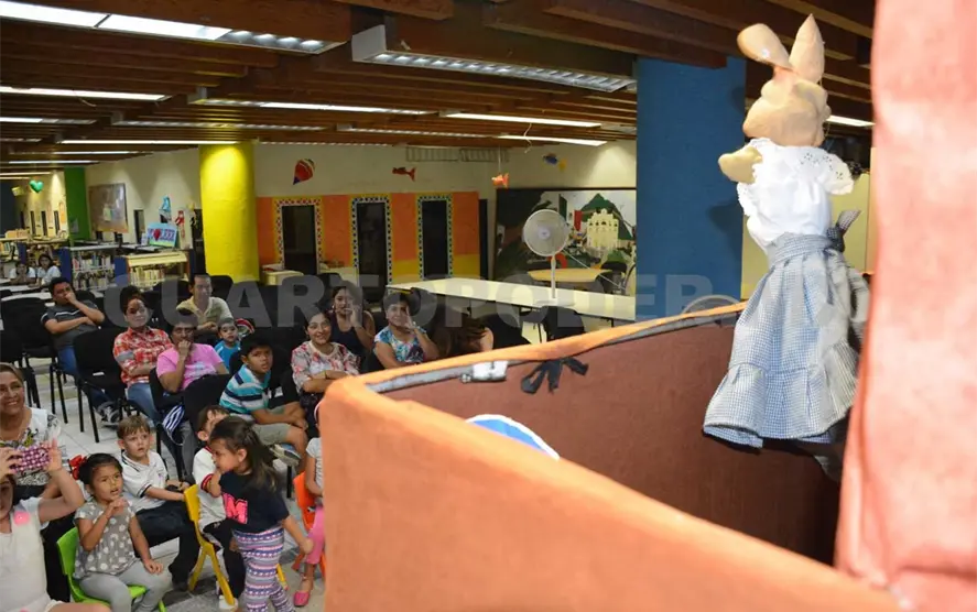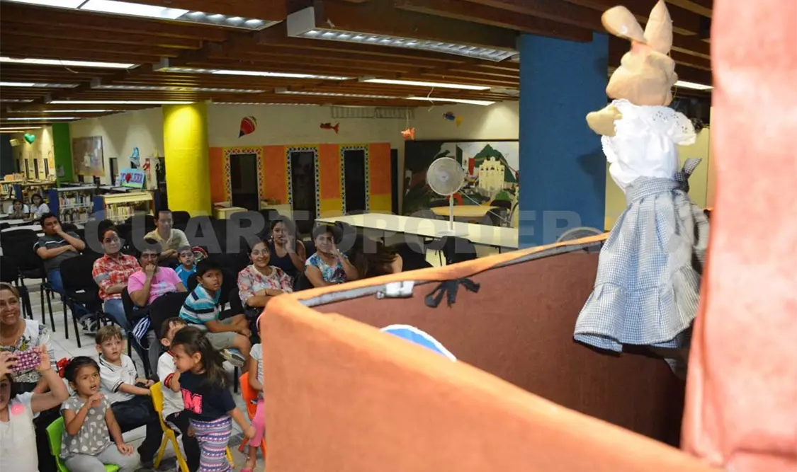 La sala infantil de la Biblioteca Pública del Estado en el centro cultural Jaime Sabines fue el lugar donde Jesús Sánchez, integrante de la compañía de títeres La Matatena, deleitó con su arte a un grupo de niños y padres de familia, presentando la historia de La varita mágica.