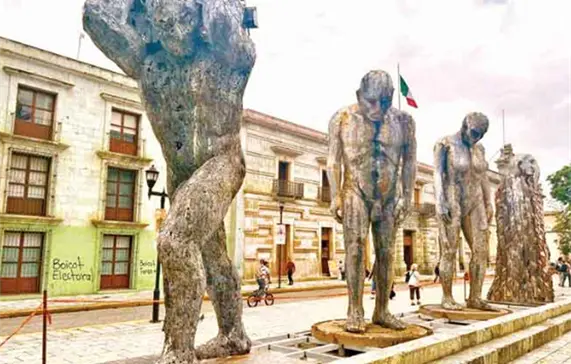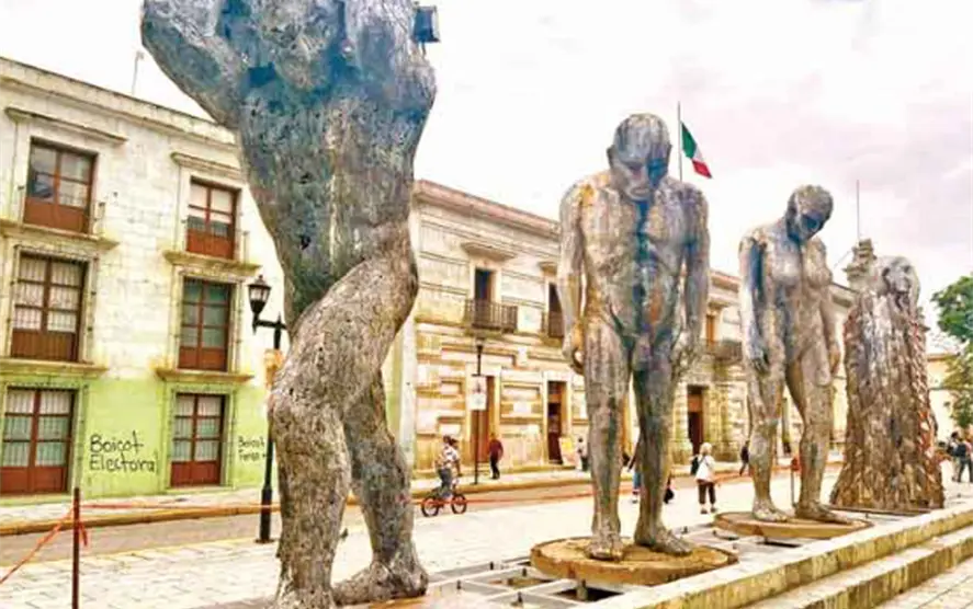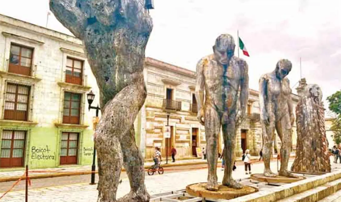 La muestra “Procesión: tiempo de gigantes”, del artista plástico Alberto Aragón Reyes, conformada por esculturas monumentales de metal y acero, tomó por sorpresa a los peatones que atraviesan por la Alameda de León, en el centro histórico Oaxaca.