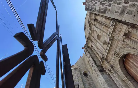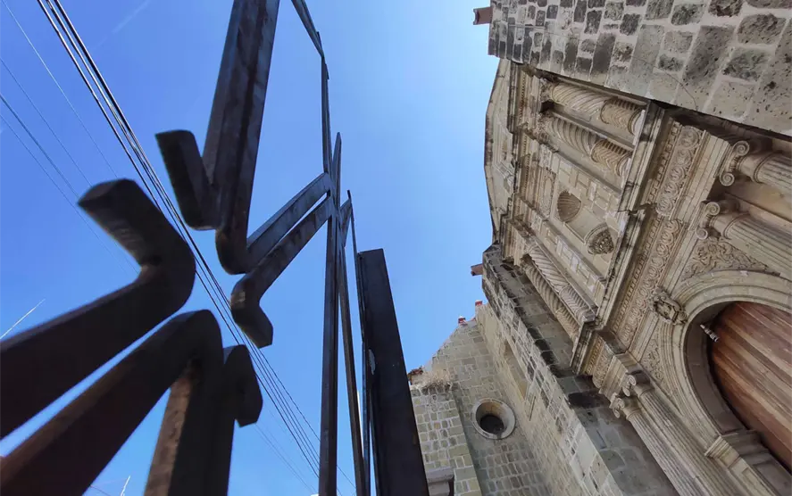 El complejo cuasi escultórico consiste en rejas diseñadas para proteger el atrio de este templo colonial de cantera verde, famoso por ser el lugar de las nupcias de Benito Juárez y Margarita Maza y al cual el maestro Toledo le creo una serie de rejas inspiradas en las espinas de la corona que la tradición católica afirma que le fue colocada a Jesús de Nazareth durante su tradición y muerte.