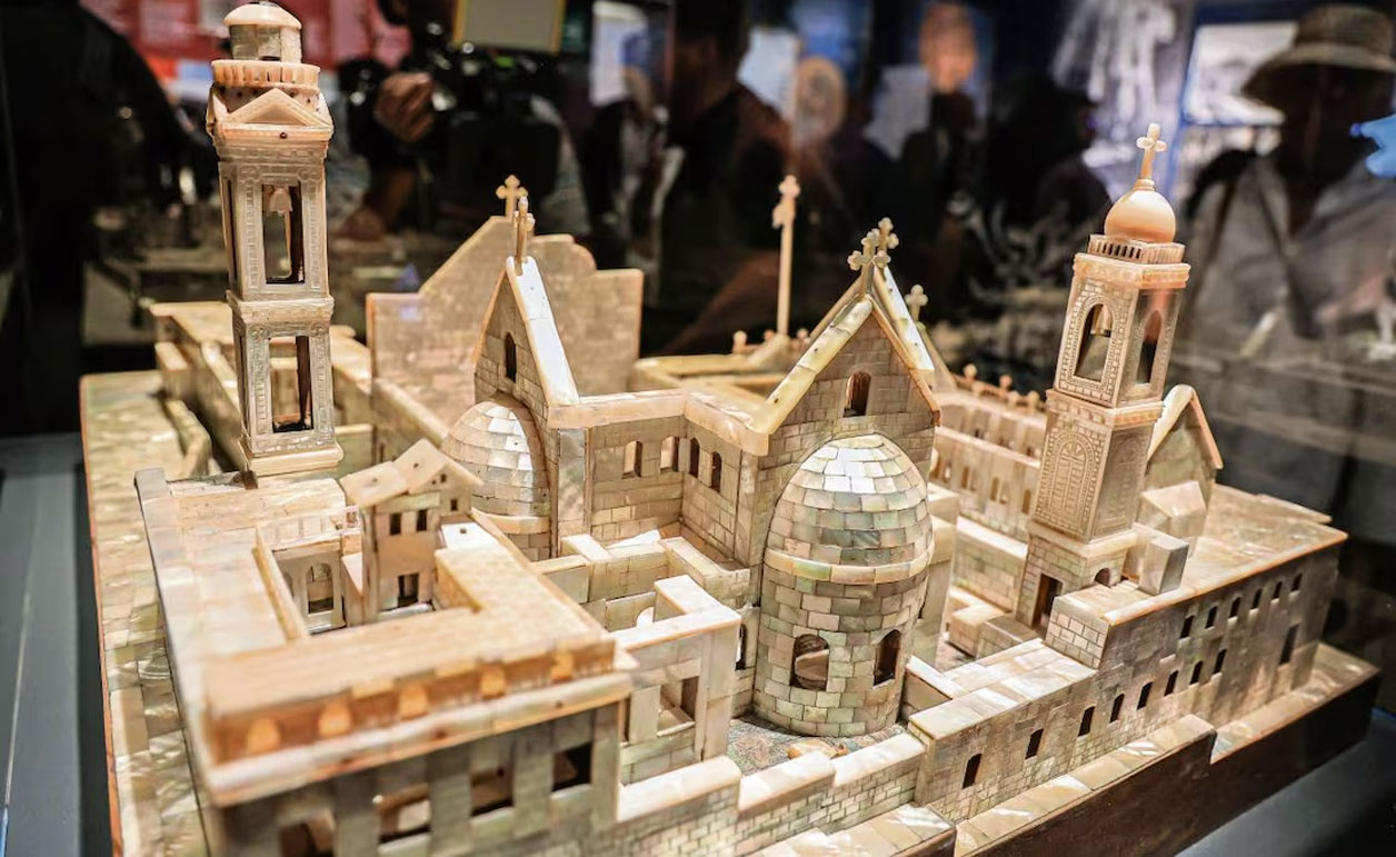 Además de fotografías y videos, la exhibición presenta una maqueta de la Basílica hecha con madreperla, vestidos típicos de Palestina, así como réplicas de los mosaicos bizantinos y lámparas de vidrio encontradas en las excavaciones arqueológicas. “Invito a todo el mundo, independientemente de sus filias y fobias políticas. No es una exposición sobre un país o un territorio, es una exposición sobre la historia de la humanidad”, concluyó Balaguer, quien destacó el posicionamiento de “no a la guerra” de España.