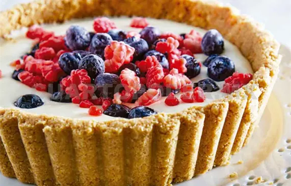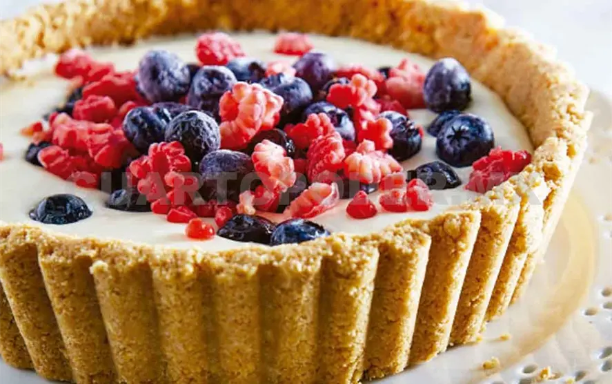 2. Congela durante una hora, acomoda los frutos rojos sobre el pay, decora con las hojas de menta y sirve de inmediato.