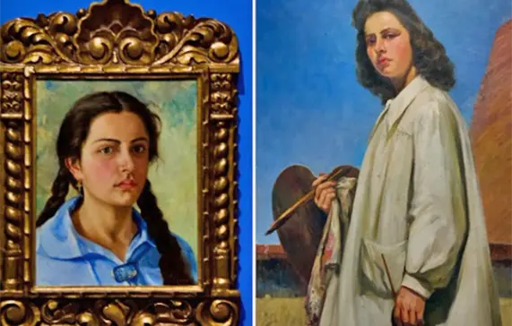 El recorrido comienza con Autorretrato con vestido azul (1930), pintado cuando Calvo tenía apenas 17 años. En este, la artista se representa con dos trenzas que caen a los lados de su rostro, ataviada en una blusa azul clara rematada con un broche. Tiene una iluminación suave y el trabajo minucioso de la obra se puede ver en los ojos y los labios.