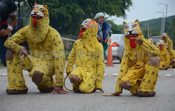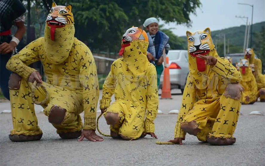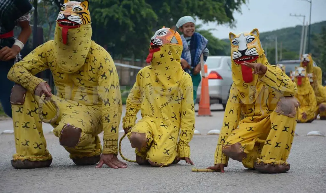 Con la danza, los tigres acompañan los recorridos en honor del Santísimo Sacramento por las principales calles de la cabecera municipal durante el Jueves de Corpus Cristi y en días previos.