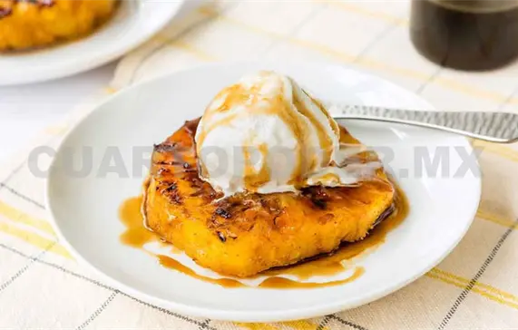 Espolvorea el azúcar y la esencia de vainilla sobre las rebanadas de piña. Ásalas por ambos lados (de preferencia usa una parrilla). Cuando se doren sácalas del fuego y sírvelas con dos bolas de helado.