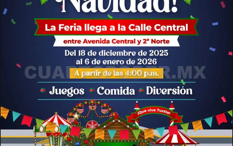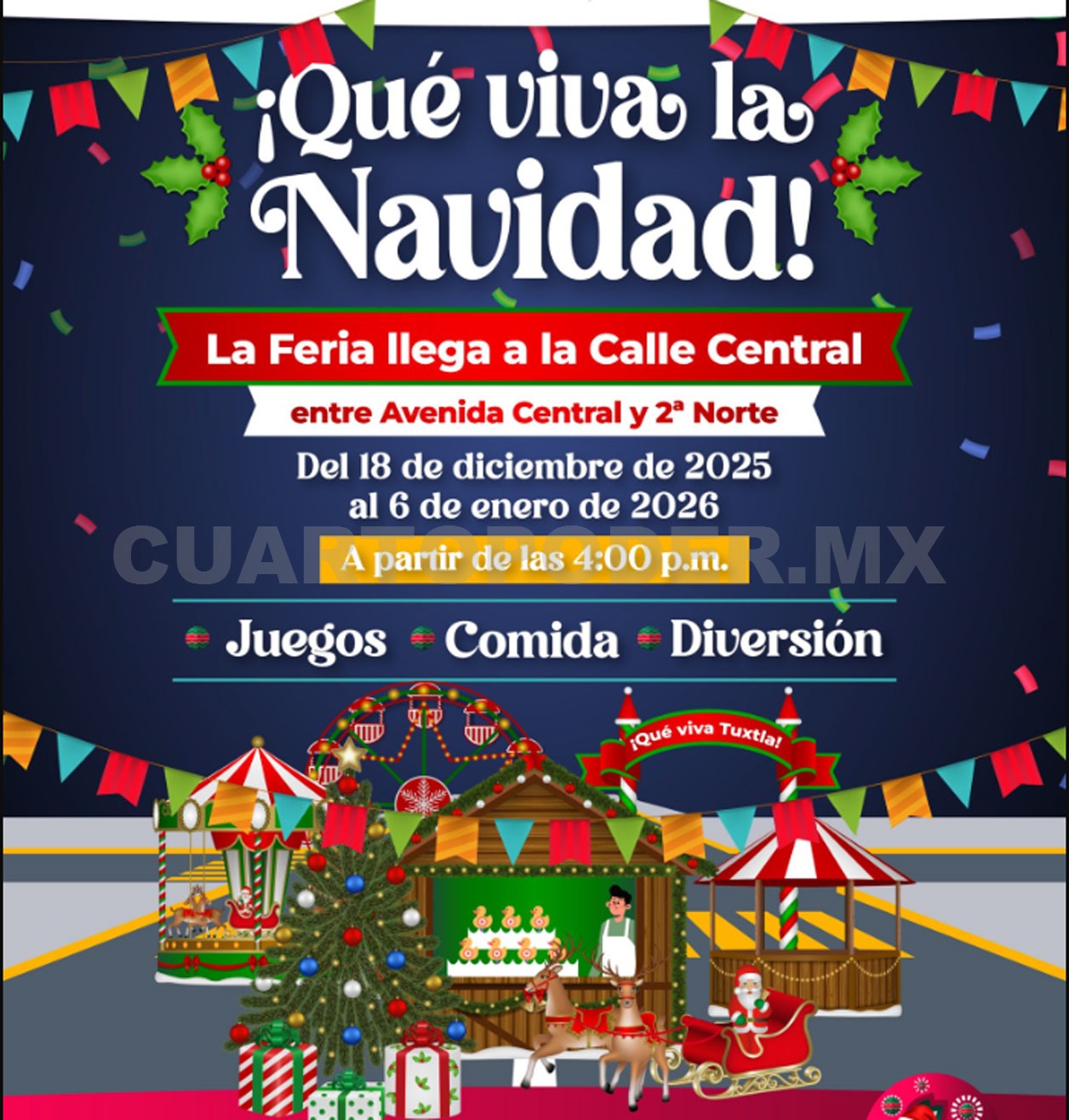 Por su parte, el presidente municipal de Tuxtla Gutiérrez, Ángel Torres Culebro, compartió a través de sus redes sociales: “Los invito a la feria navideña ¡Que Viva la Navidad!, que llega a la calle central, entre avenida central y 2ª Norte, para disfrutar juegos, comida y diversión en un ambiente familiar”.