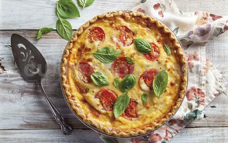 Espolvorear queso parmesano en la base de la tarta. Agregar las cebollas y las rodajas de tomate; luego, el perejil y la albahaca picados, y terminar con otra capa de queso. Hornear a 180o C y cocinar entre 35 y 40 minutos. Sacar y decorar con hojas de albahaca.MINI QUICHES DE BRÓCOLI CON QUESO