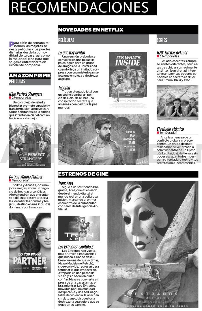 Para el fin de semana tenemos las mejores series y películas que puedes disfrutar desde la comodidad de tu casa, así como lo mejor del cine para que salgas a entretenerte en excelente compañía.