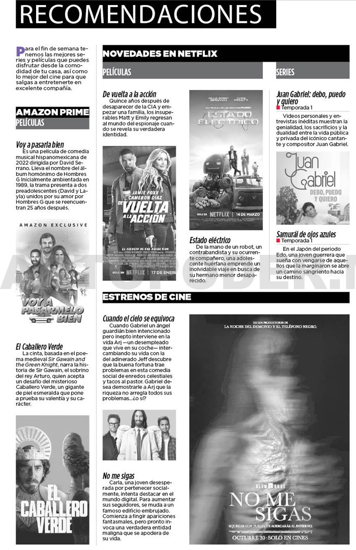 Para el fin de semana tenemos las mejores series y películas que puedes disfrutar desde la comodidad de tu casa, así como lo mejor del cine para que salgas a entretenerte en excelente compañía.