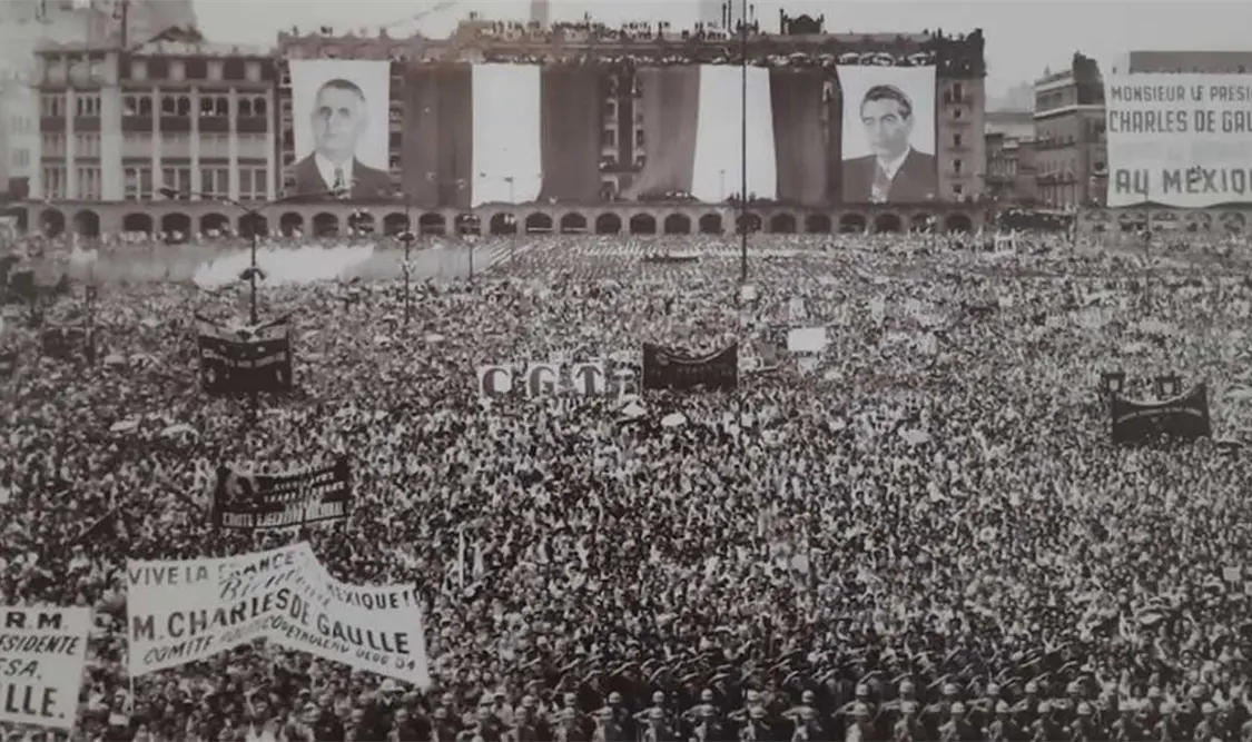 En las imágenes se puede dar un vistazo a la visita de tres que hizo el presidente Charles de Gaulle con su esposa Yvonne Marie Vendroux. El general francés fue el primer mandatario extranjero en dar un discurso desde el balcón de Palacio Nacional, un discurso que dio en español ante miles de asistentes y que se hizo famoso por su frase en la que propone que Francia y México caminen de “la mano en la mano”. En su estancia en la capital visitó Ciudad Universitaria, donde se desbordó el numeroso público que fue a verlo al auditorio Justo Sierra de la Facultad de Filosofía y Letras. De Gaulle también visitó el Ángel de la Independencia, la Basílica de Guadalupe, la Unidad Habitacional Independencia y viajó a Teotihuacán.