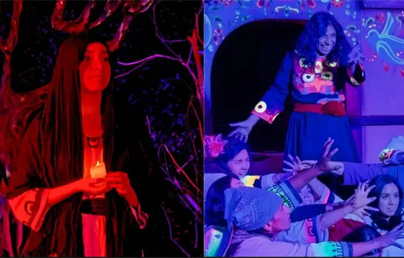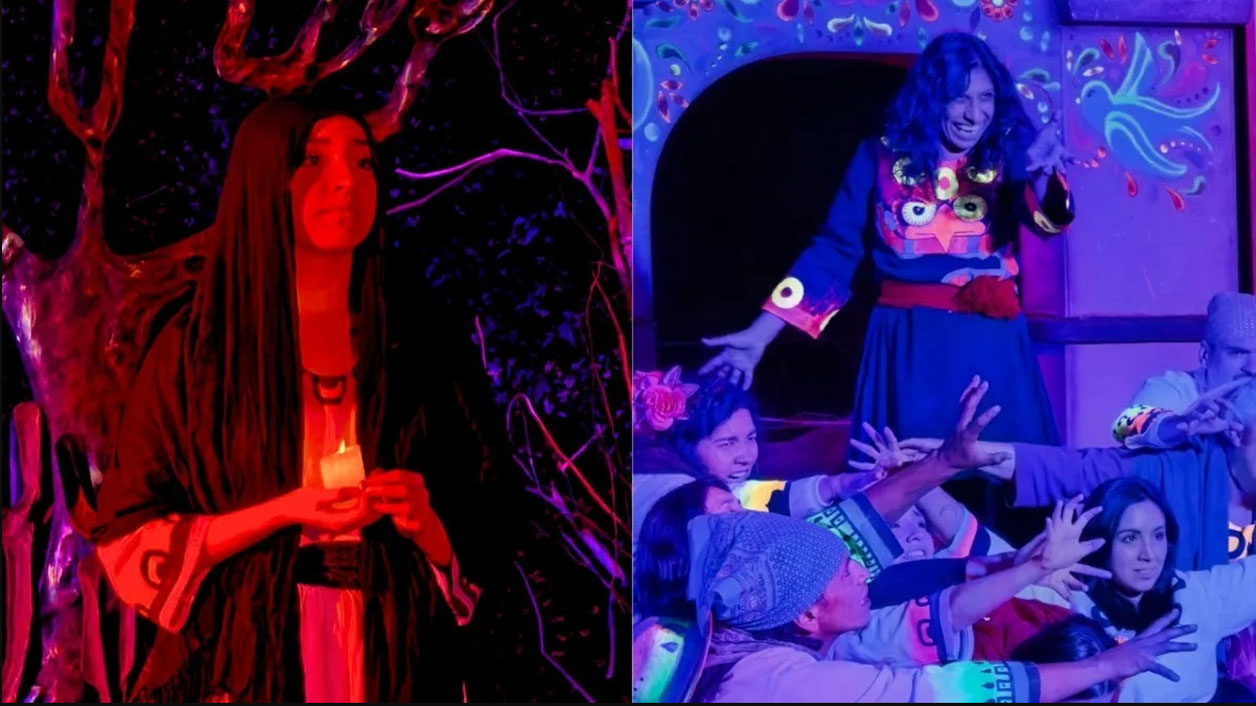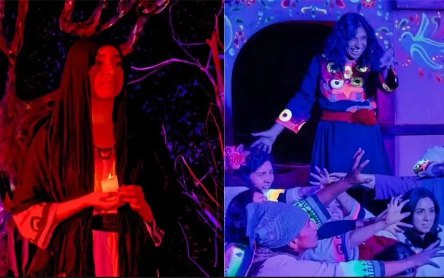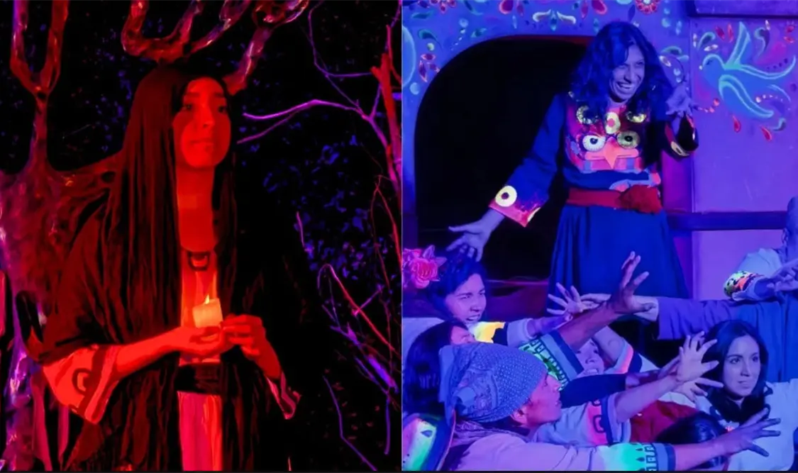 Los actores representan la leyenda de Tlahuipochi, “la mujer que extrae la sangre de los niños, se quita las piernas en el tlecuil (fogón), se convierte en bola de fuego y sale volando de los cerros para buscar a recién nacidos”, cuenta Mila Román, productora del evento.