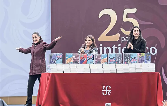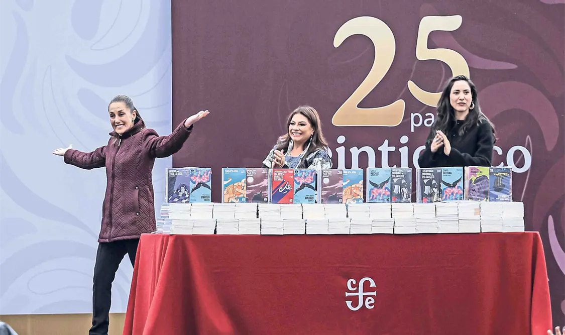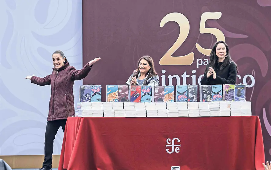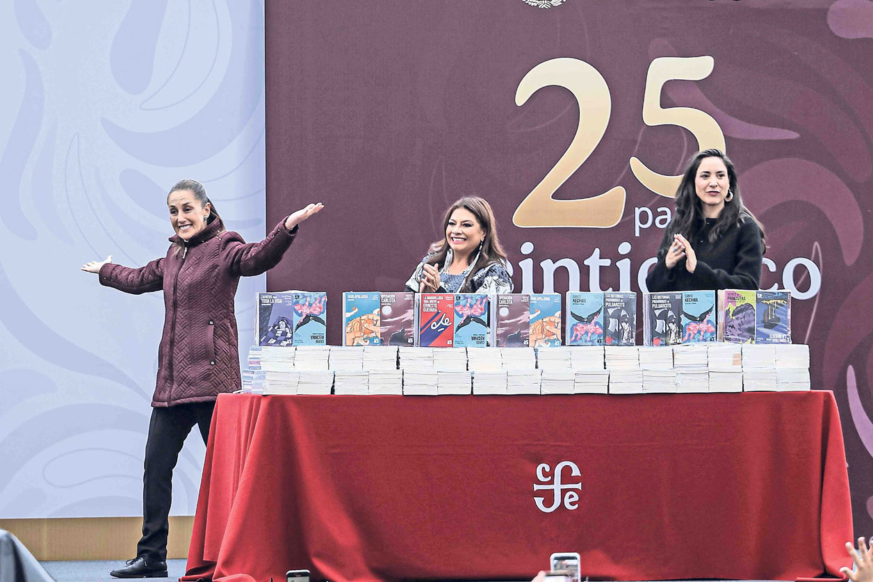 Con la imagen de decenas de jóvenes que se arremolinaban en una carpa para intentar conseguir títulos de la colección 25 para el 25 que los trabajadores del Fondo de Cultura Económica entregaban o, incluso, lanzaban, y en medio una lluvia intensa que apresuró el evento encabezado por la presidenta Claudia Sheinbaum, así terminó la primera entrega en el Zócalo de la Ciudad de México de una colección que ha costado 25 millones de pesos.