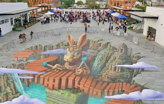 El Buró Municipal de Turismo detalló que Tuxtla Gutiérrez se llenó de color y perspectiva con una impresionante obra de arte en piso, la cual fue creada por tres de los más grandes exponentes del arte anamórfico en México con reconocimiento internacional. “Con más de 400 metros cuadrados, la obra utiliza la técnica del anamorfismo para representar elementos icónicos de la identidad chiapaneca y tuxtleca, como cascadas, zonas arqueológicas y un puente formado por marimbas. Además, integra la figura del conejo, símbolo que da origen al nombre de nuestra ciudad”, compartieron los organizadores.